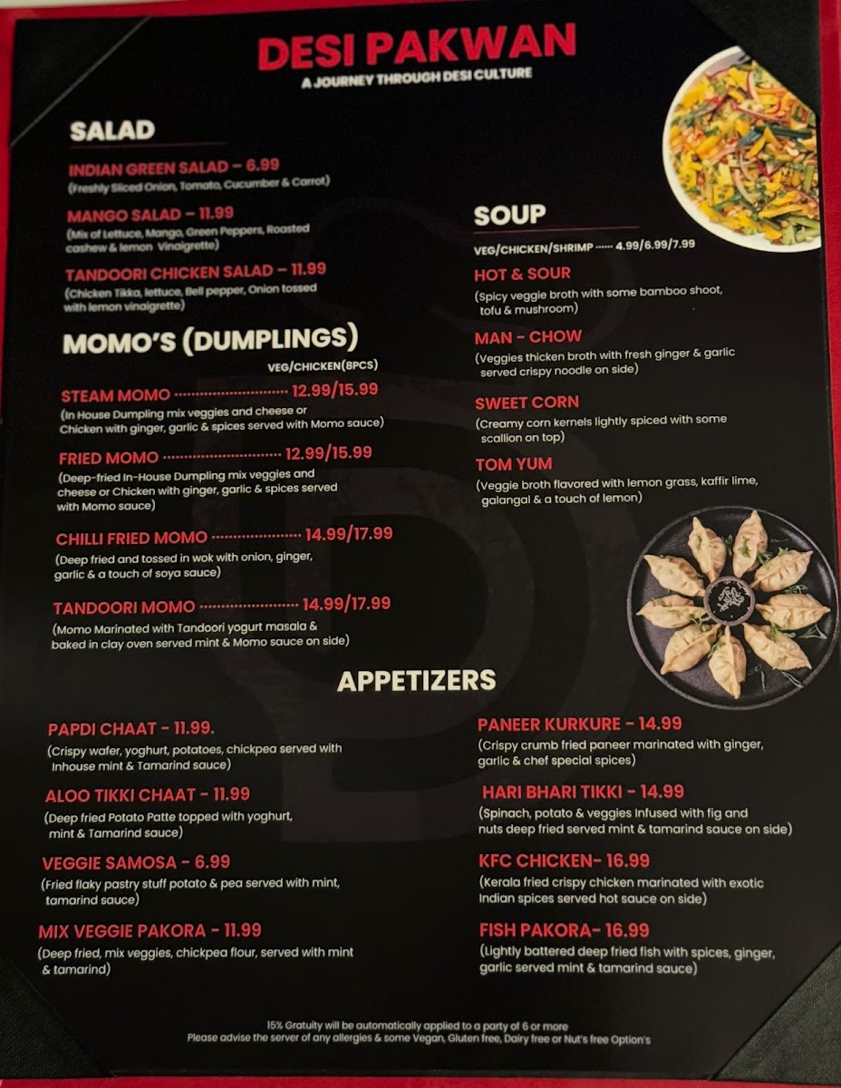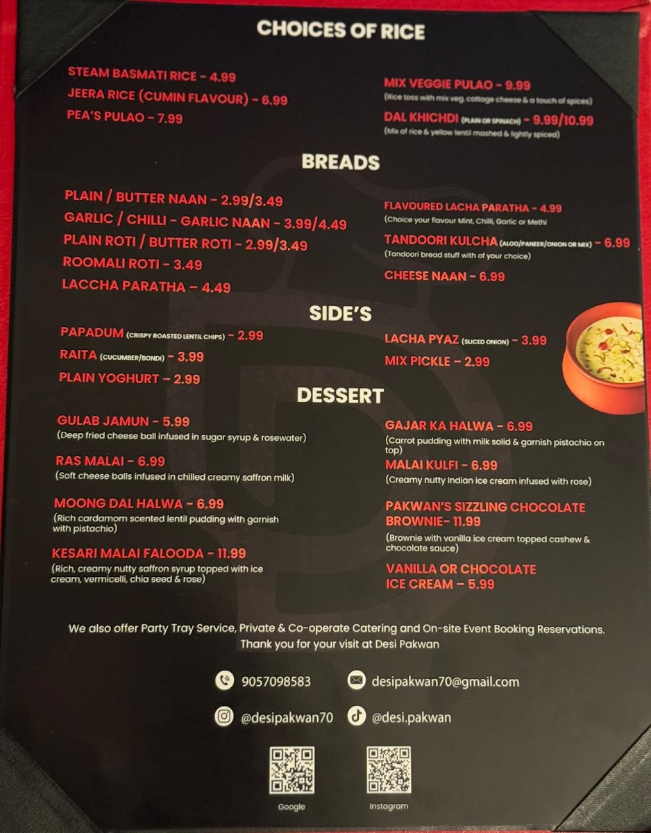 The menu at Desi Pakwan also boasts a selection of delectable desserts, including the traditional Rasmalai and Gajar Halwaa, perfect for indulging your sweet tooth.